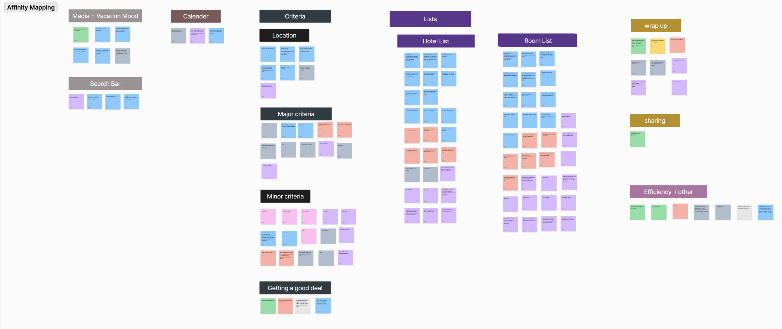 In order to do a thorough analysis of all of the user interviews, I did an affinity map where I moved all of my notes onto stickies. Each stickie had a single bullet point. I then organized the notes into themes. This method of analysis helped to surface key areas where I should focus in creating the booking flow.