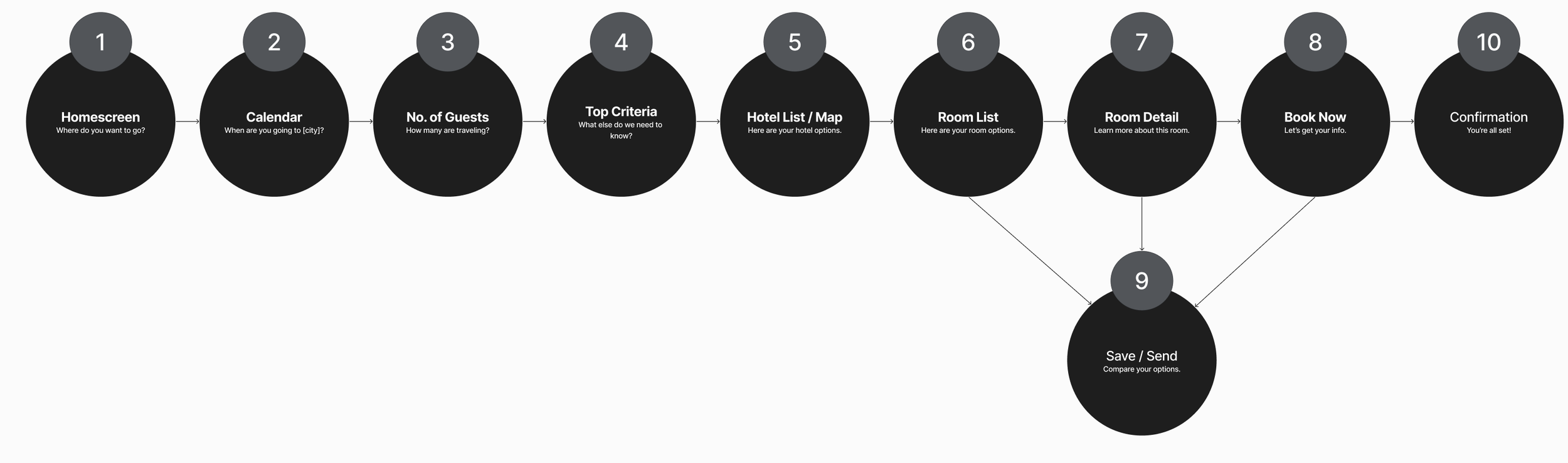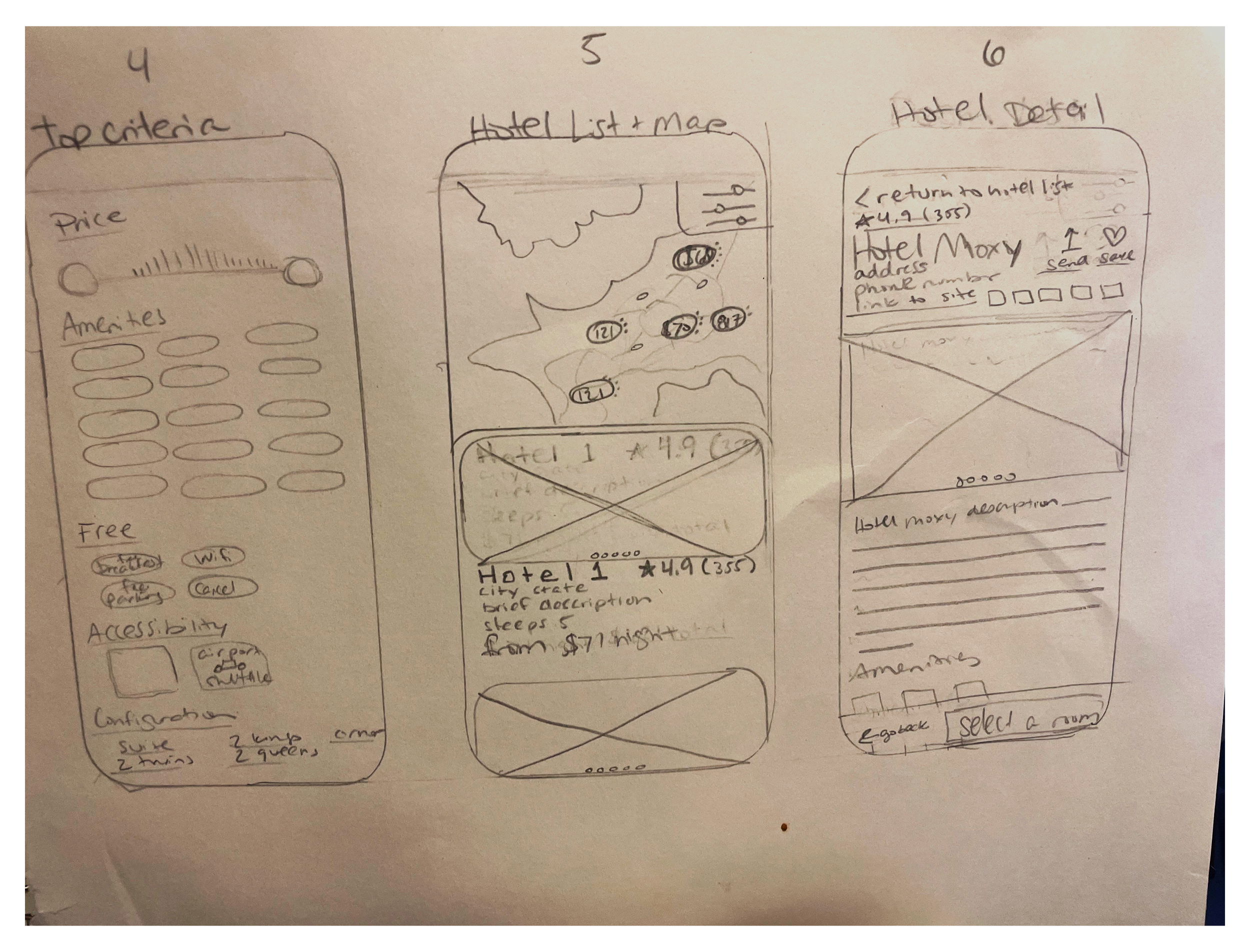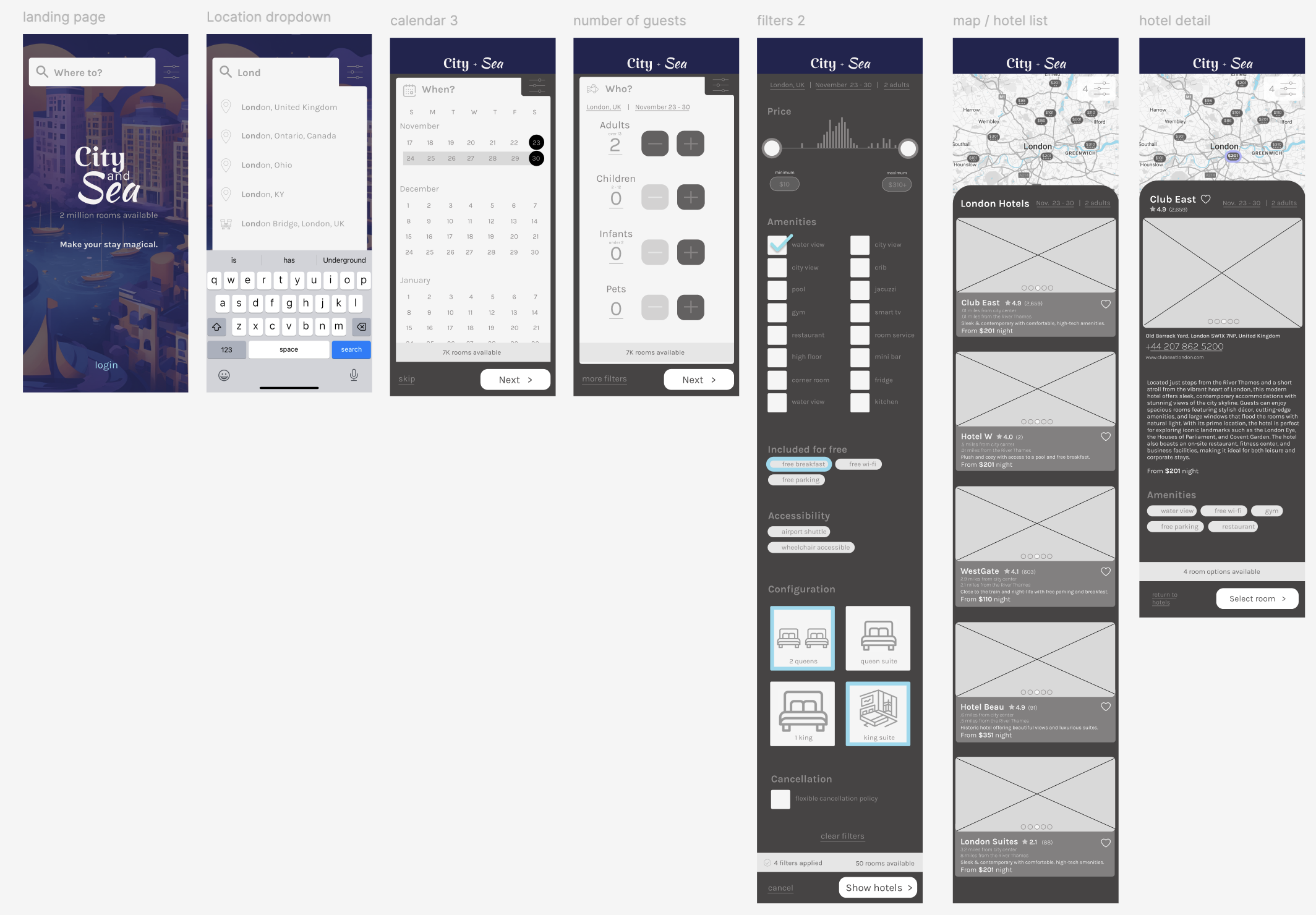 My goal was to create a clean, intuitive design that utilized progressive disclosure to provide the right information at the right time. I included chunky / easy to hit buttons when possible, and a map feature that makes it easy to jump back and forth between the map and the hotel list. Calls to action were designed to be easy to locate and understand.