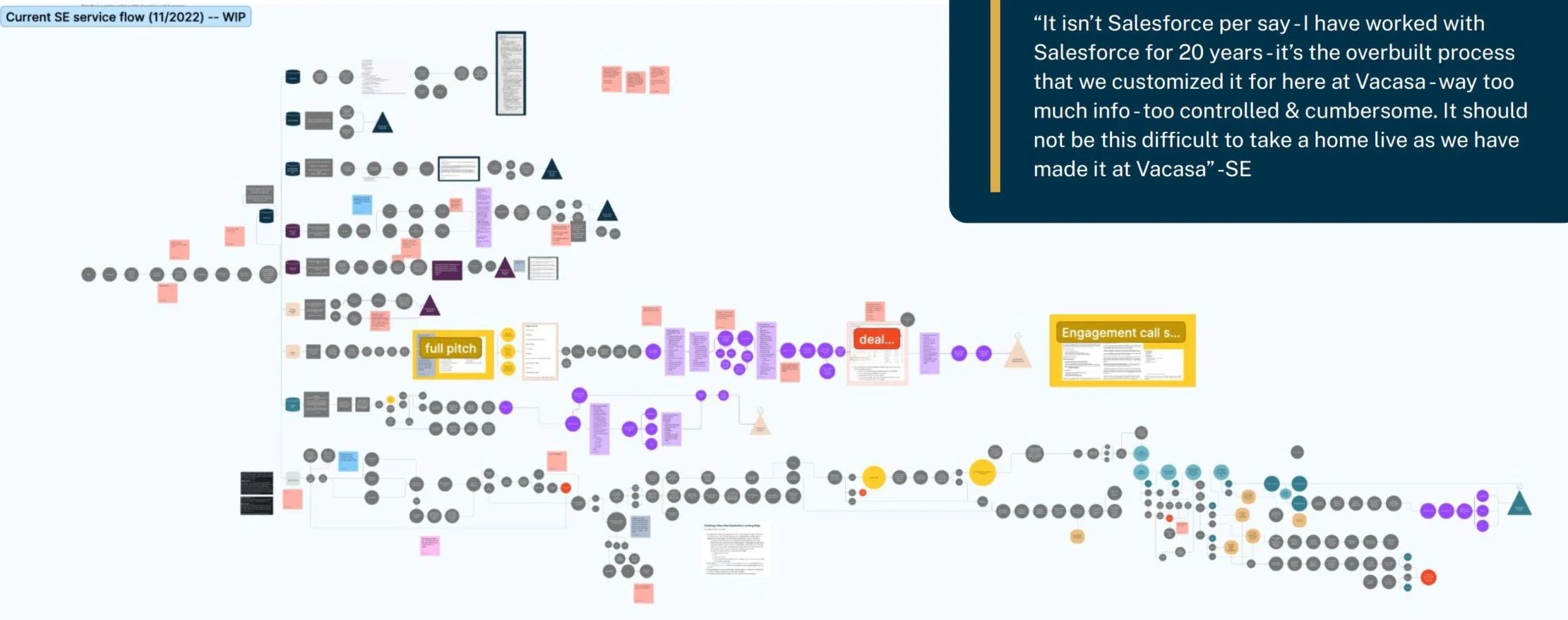 As I started becoming familiar with the sales process, I truly empathized with the sales executives. The current process was slow and confusing. I became obsessed with helping them and threw myself into documenting the entire current process because I knew that having all of those details would put me in a better position to craft solutions. I created the diagram shown here to visually represent the many steps that the sales reps took for each sale. I also included training documents and scripts in here as well so I had all of the information in one place. I was unfamiliar with the complex process so doing it this way helped me to figure out what I was missing and set me up for my next interview.