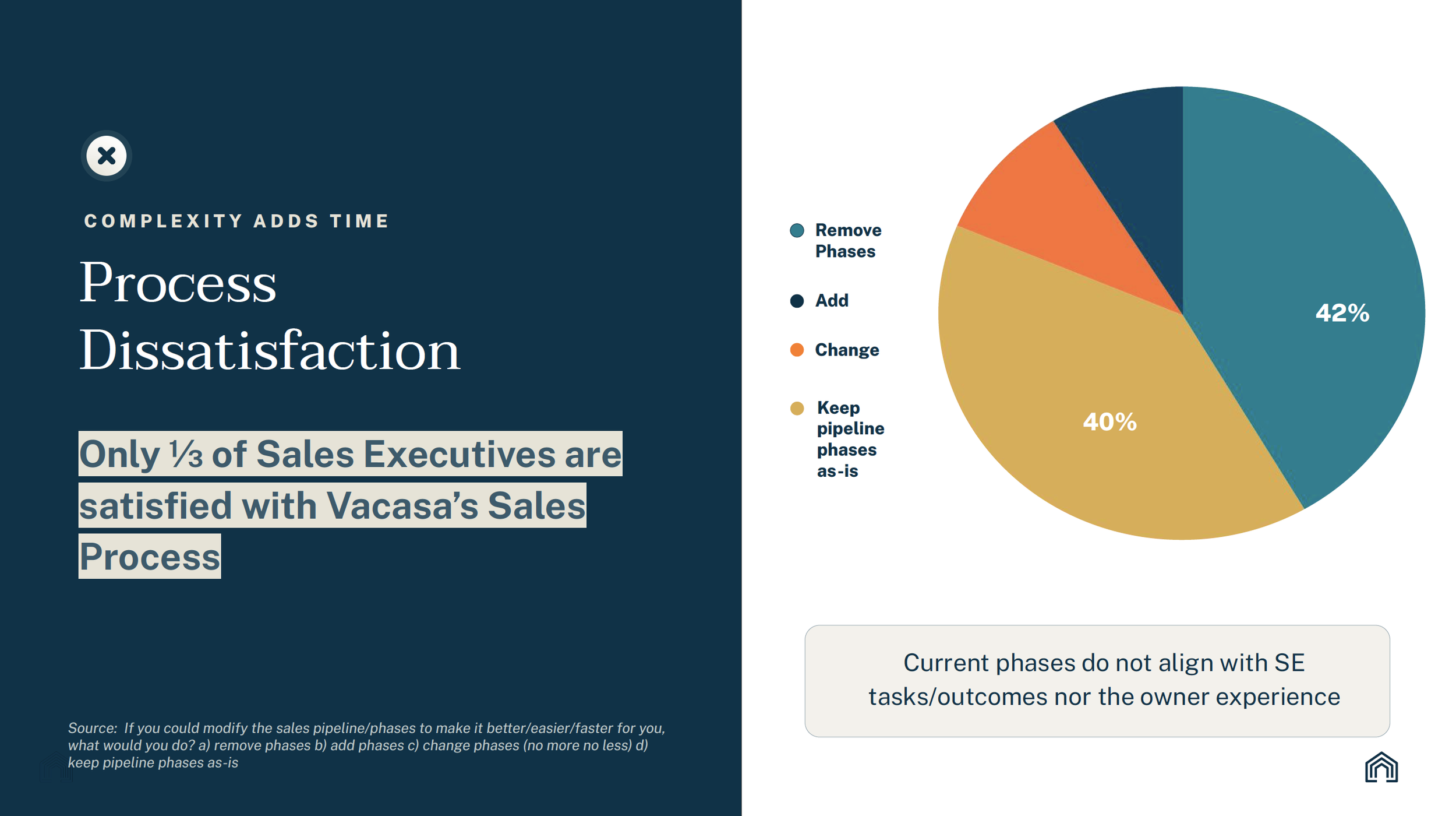 Sales executives needed to clear their schedule and focus on their main task: closing deals. Vacasa needed foundational understanding of how their sales team currently worked, a vision of how it should work, and then a strategy that took sales process from current state to future state.