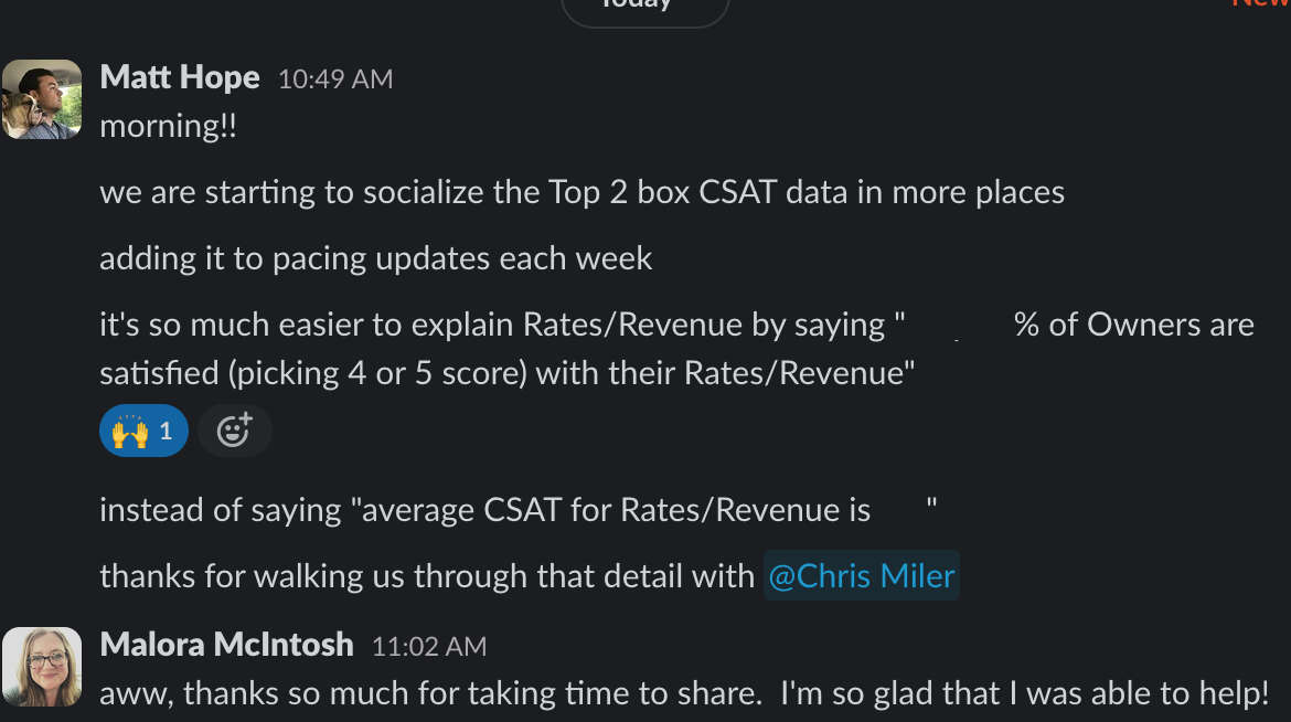 Quantitative survey data: I have used Qualtrics and similar tools in the past, however, at Vacasa we used Google Forms. If I needed something quick, sometimes I utilized Google’s analysis and data visualizations, but typically I needed a more detailed analysis so I would download the data and manipulate it in Excel using the filtering, pivot, and visualization functionalities.