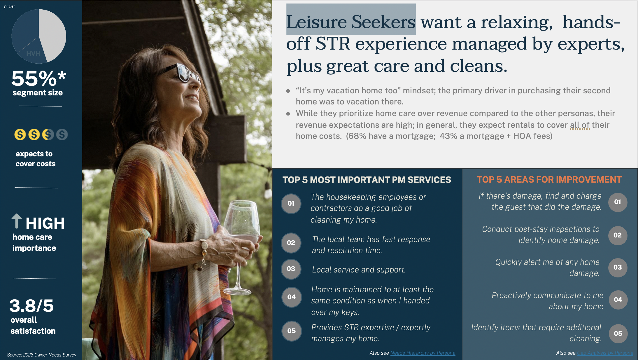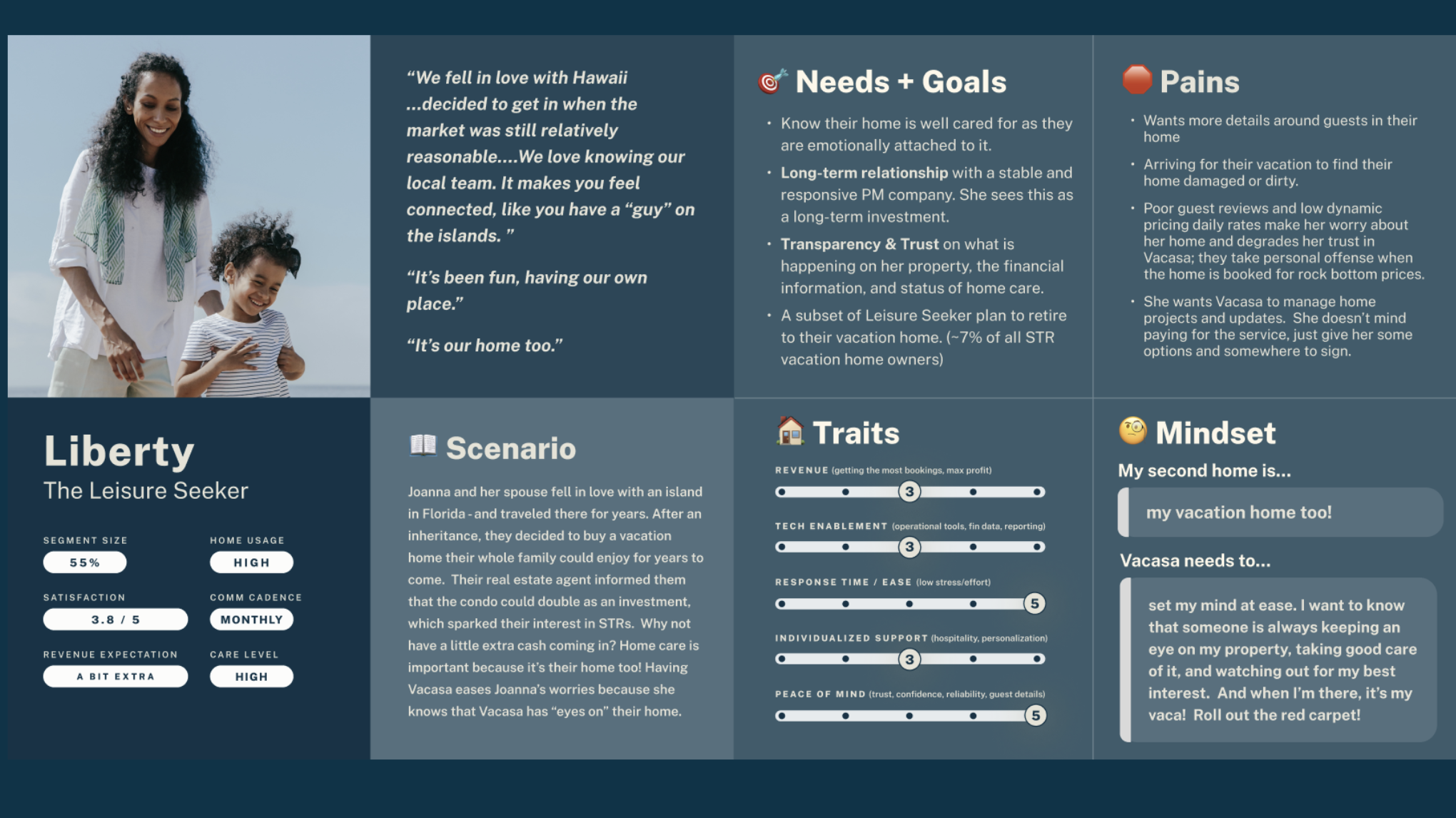 For these personas, I and grouped owners by mindset, rooted in purchase and rental intentions, expectations, needs, goals, and challenges.