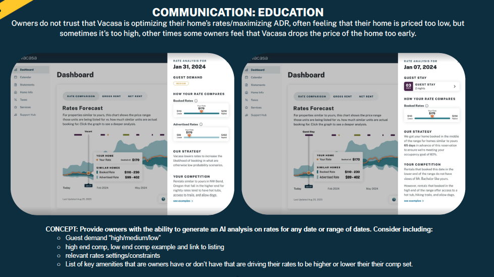 Because homeowners weren’t making as much revenue as they did in previous years, they were less trusting of how Vacasa was pricing their home. The call center was being inundated with revenue related concerns and product was tasked with increasing engagement with homeowners to better communicate the nature of their decreased revenue — at scale.