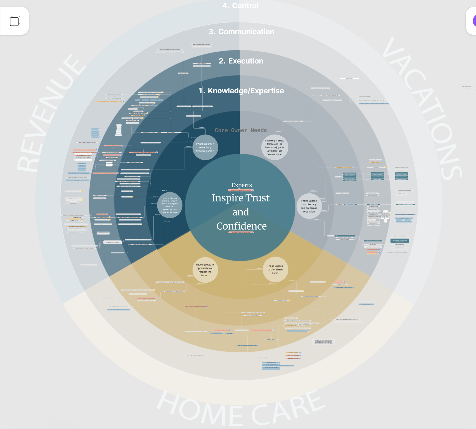 The future intent of this diagram is to also act as a library. Vacasa did not have the budget to hire a research librarian, so I wanted to create something that made it easy to understand the customer’s needs and find information about each need.